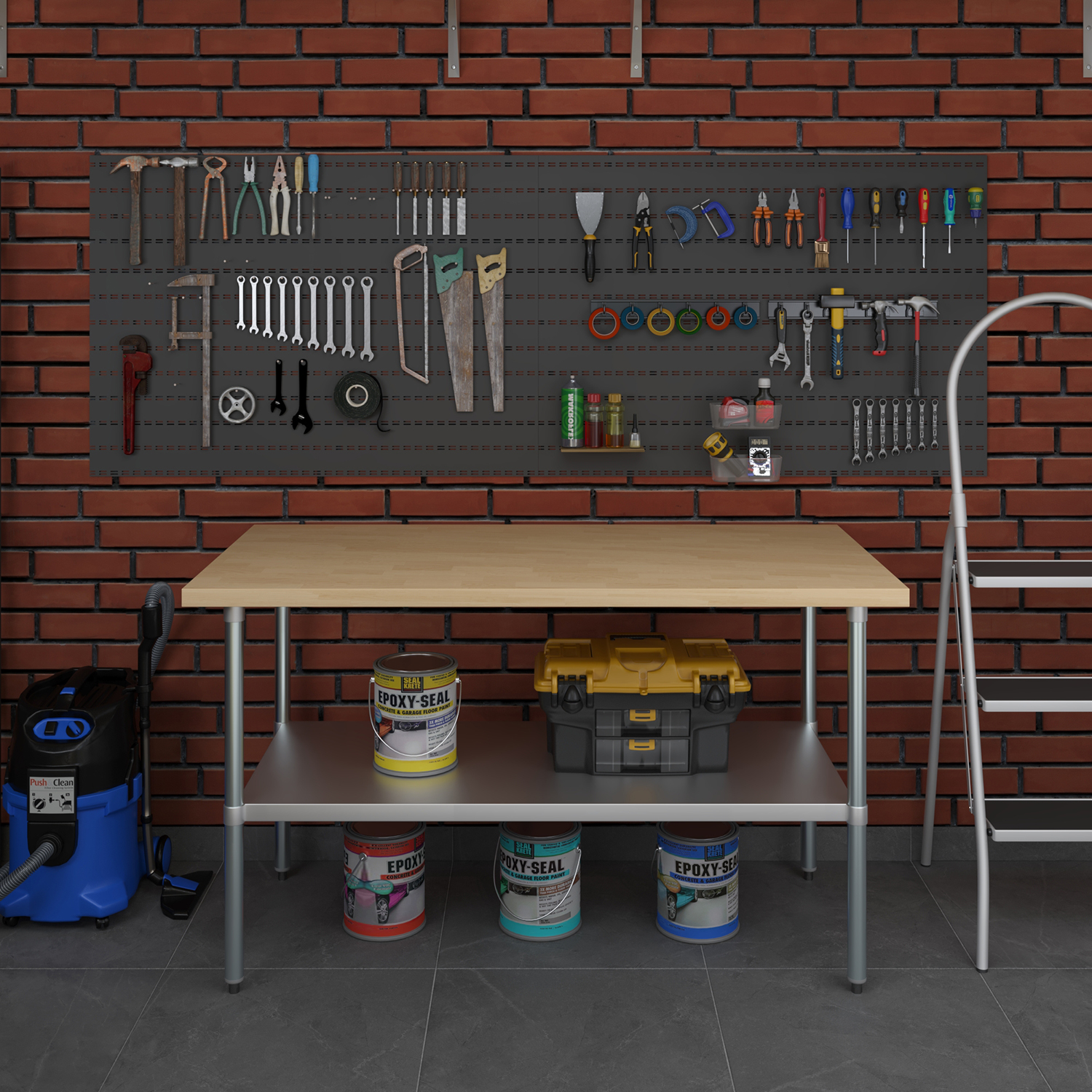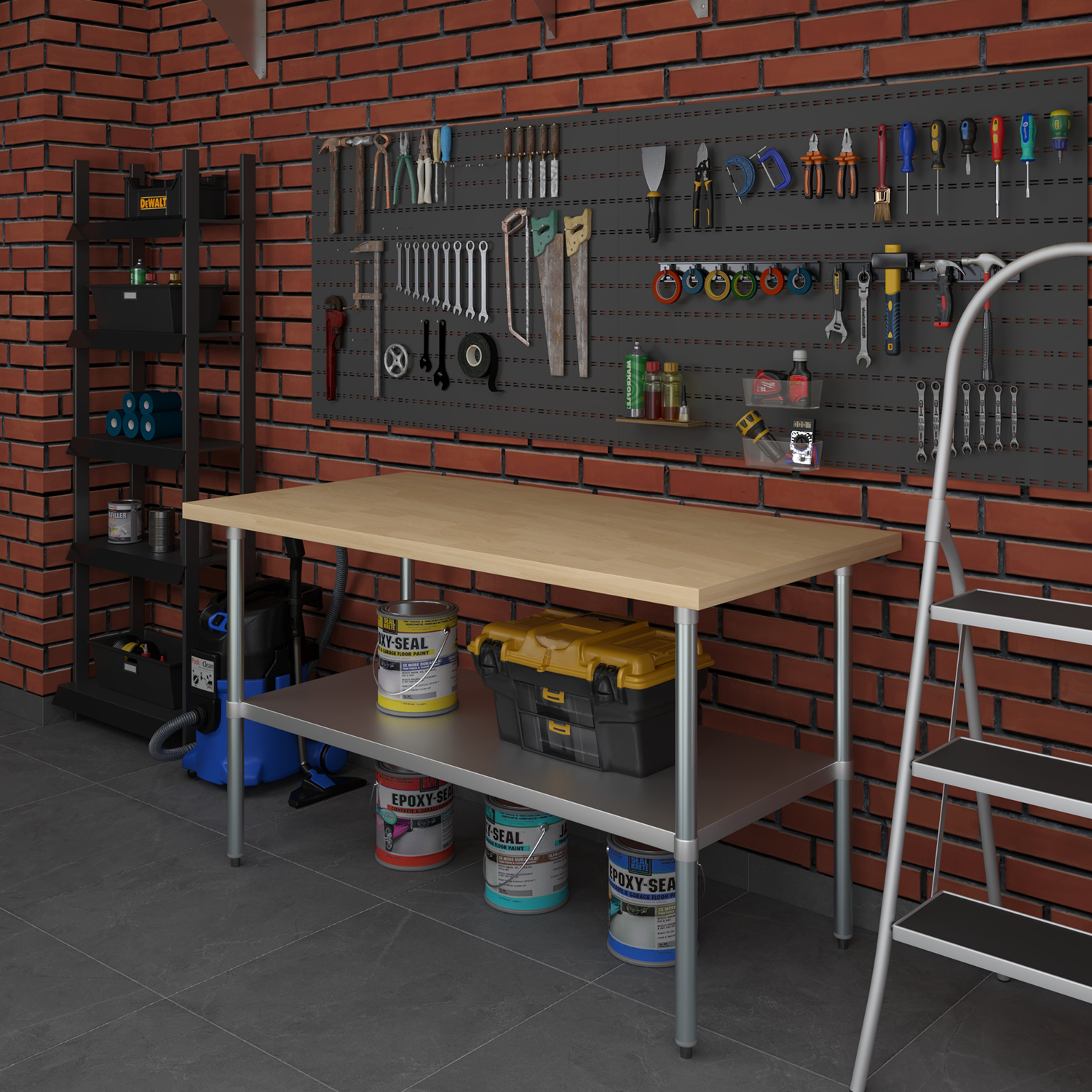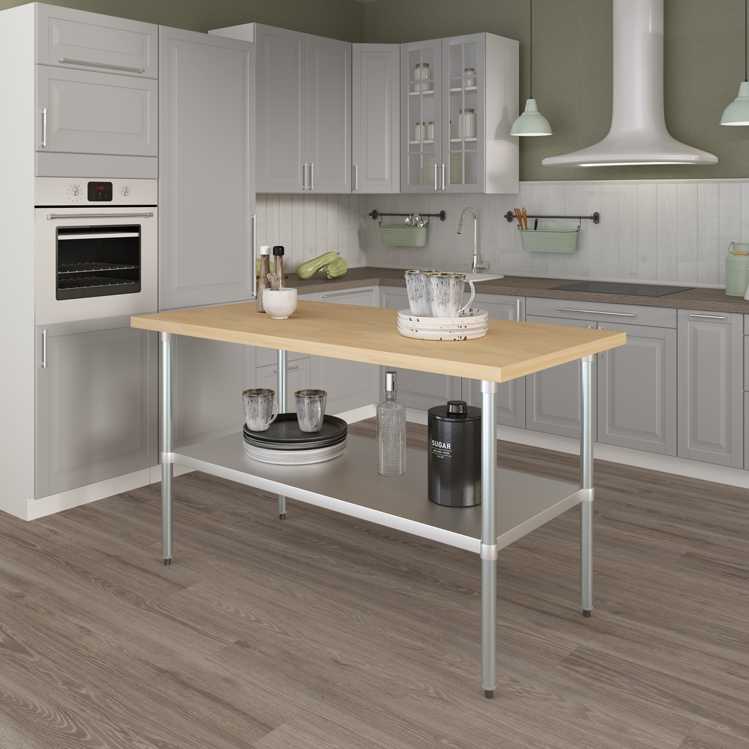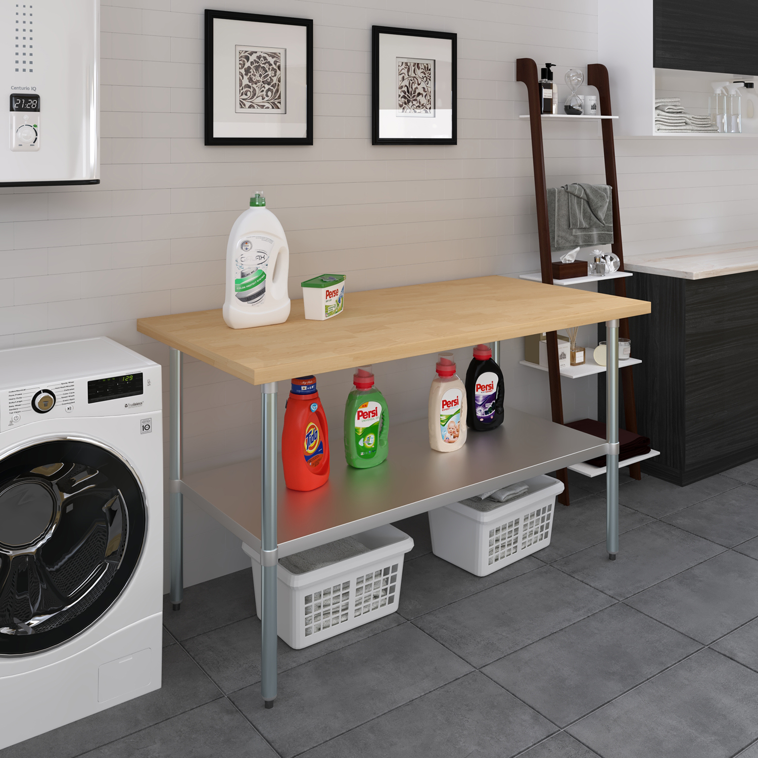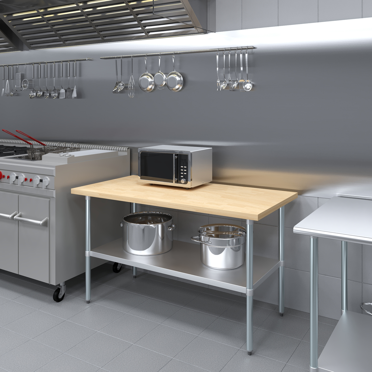 The table is equipped with an adjustable undershelf made from galvanized stainless steel, offering versatile storage options to keep your workspace organized and efficient. The undershelf can be easily adjusted to accommodate items of different sizes, providing a customizable storage solution that suits your specific needs. Whether you need to store kitchen supplies, tools, or equipment, this undershelf helps you maximize your storage space and maintain a clutter-free work area.