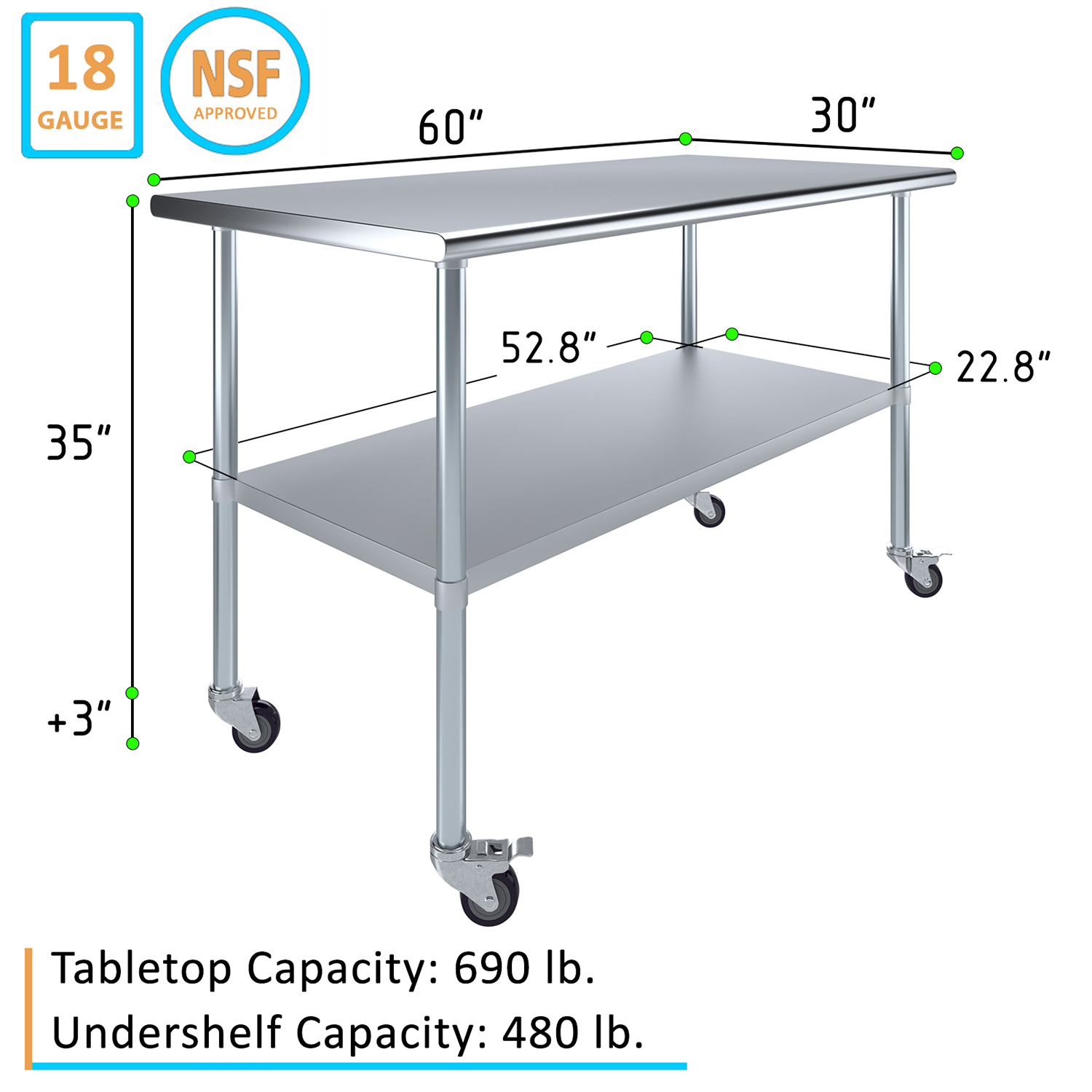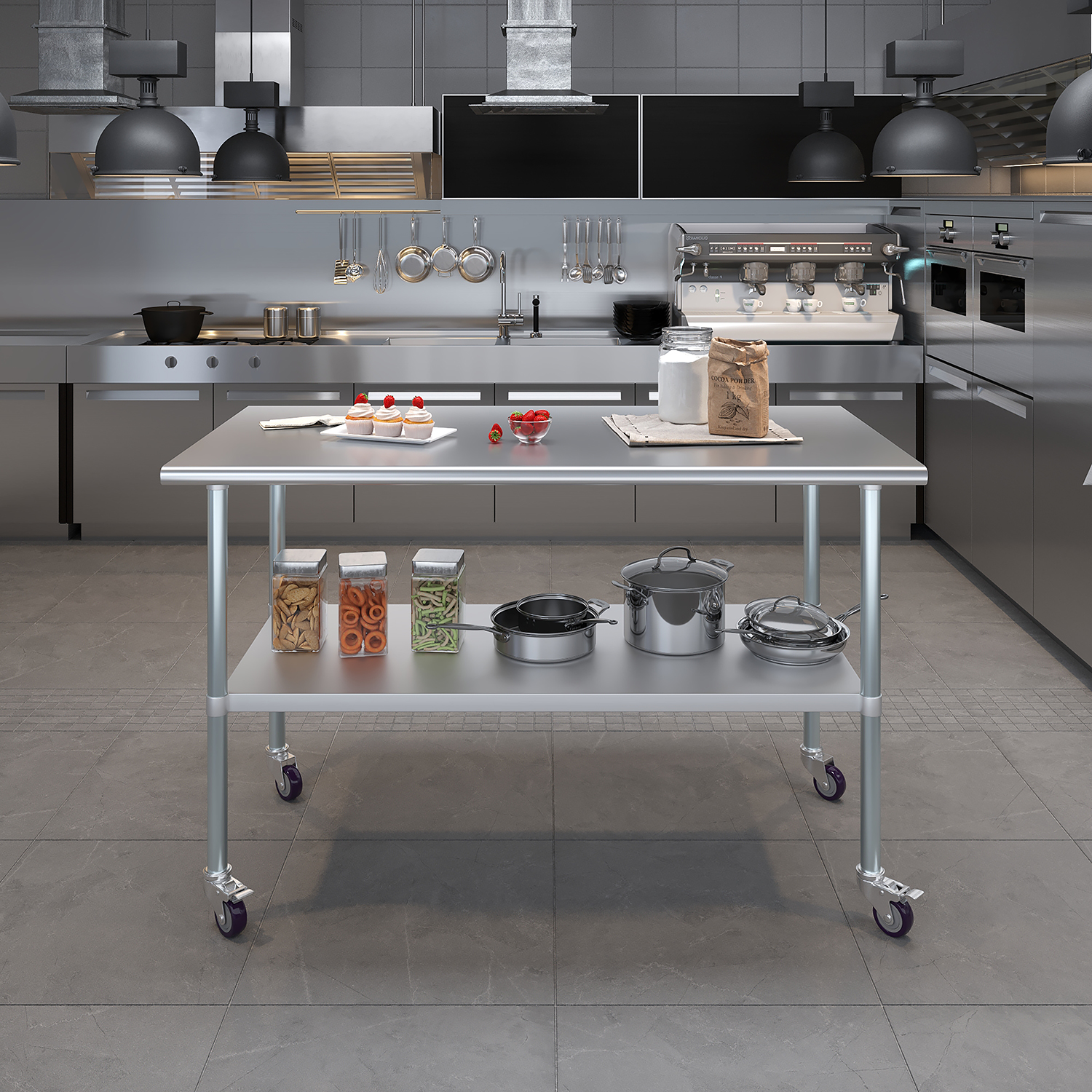 Optimize your workspace with the 30″ x 60″ Stainless Steel Work Table featuring an undershelf and a set of four wheels for enhanced mobility and storage. This work table is constructed from 18GA/430 stainless steel, ensuring a durable, easy-to-clean surface. Designed for demanding environments such as commercial kitchens, laboratories, and workshops, this table guarantees long-lasting performance and reliability.