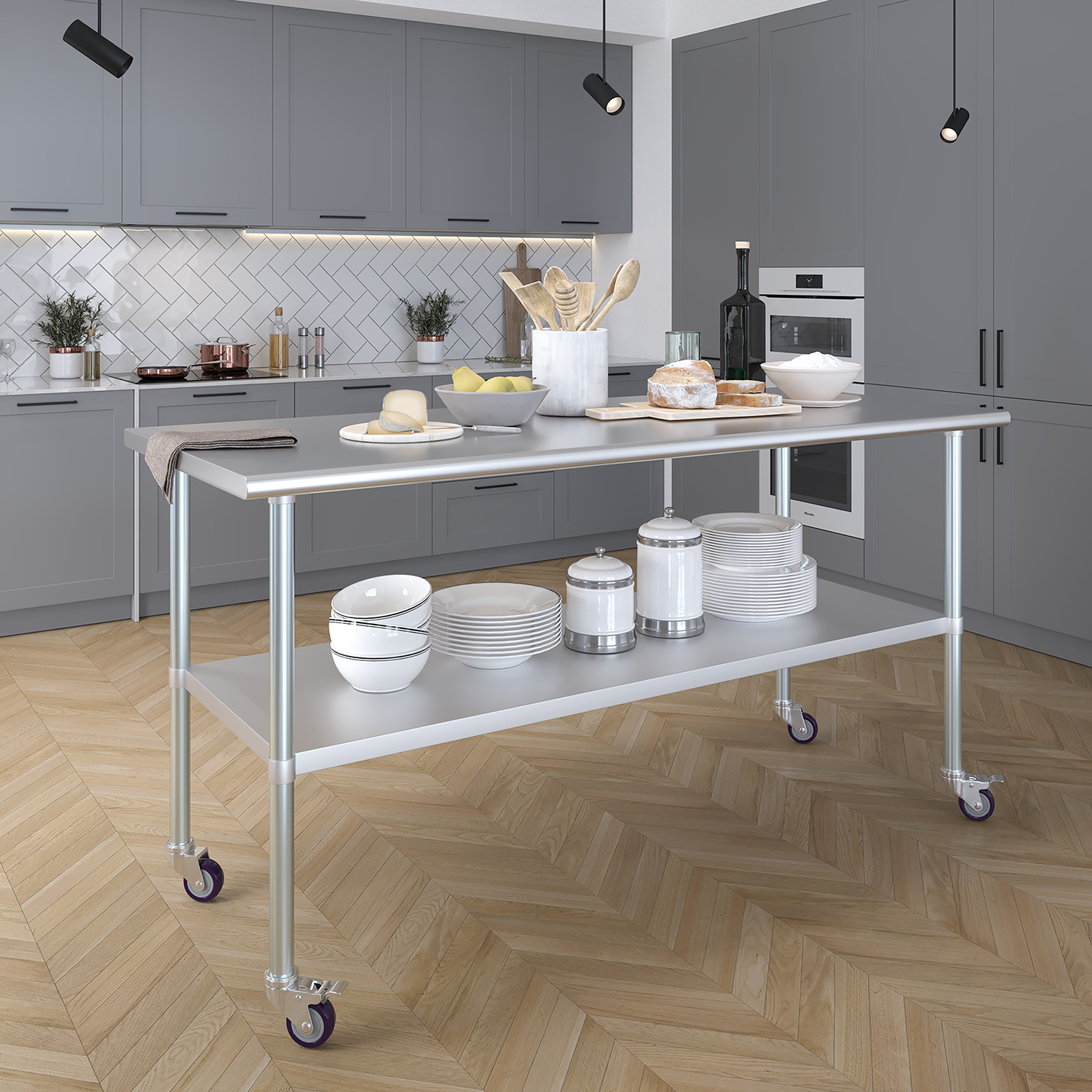Upgrade your workspace with this versatile and practical work table that combines high functionality with contemporary design. Perfect for enhancing productivity and organization, the 30″ x 72″ Stainless Steel Work Table with Undershelf and Wheels is an indispensable asset for any professional setting, providing durability, convenience, and efficiency in a compact, mobile unit.
