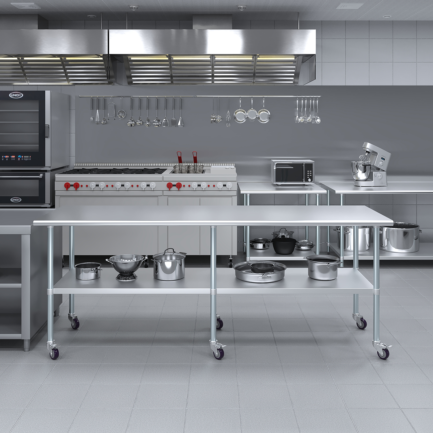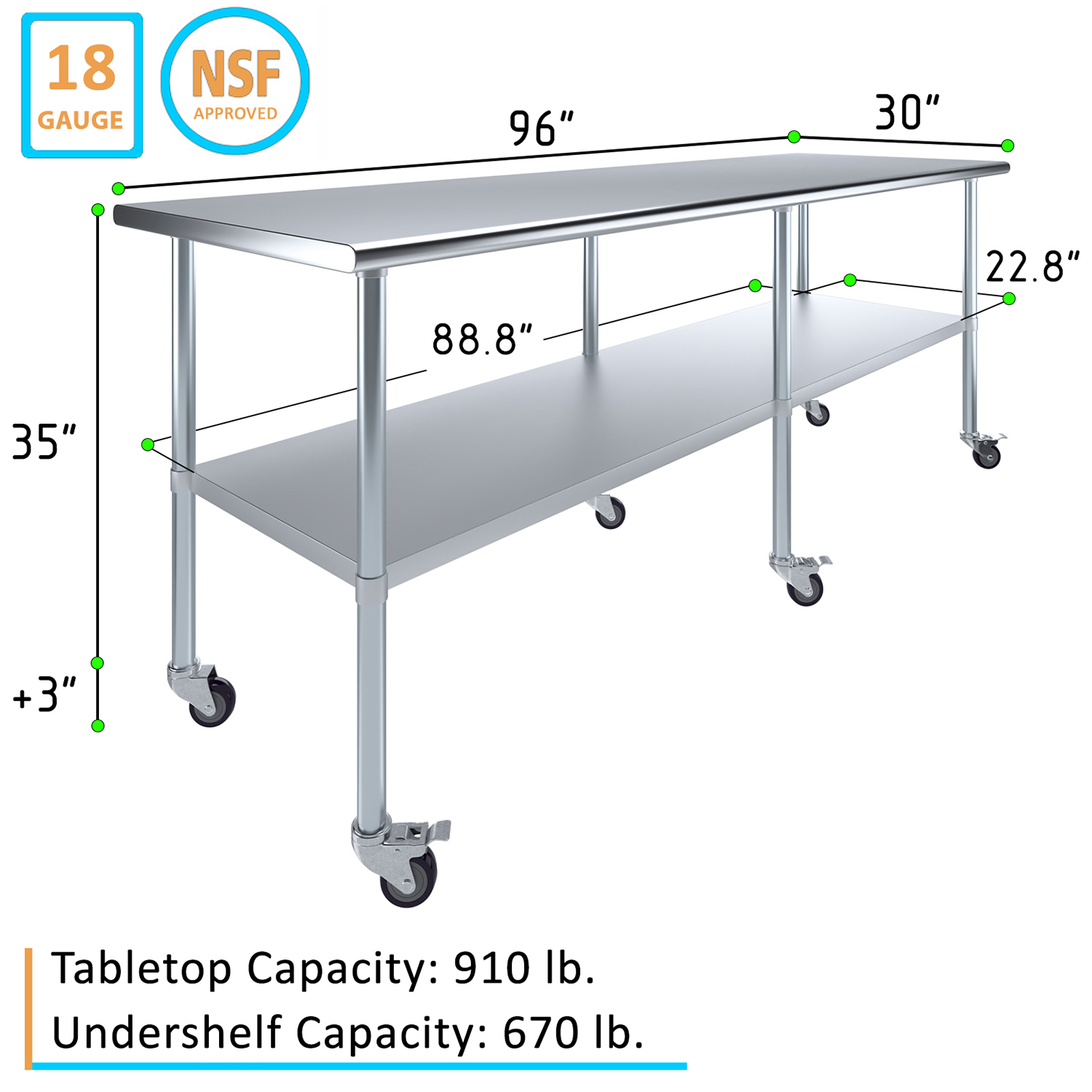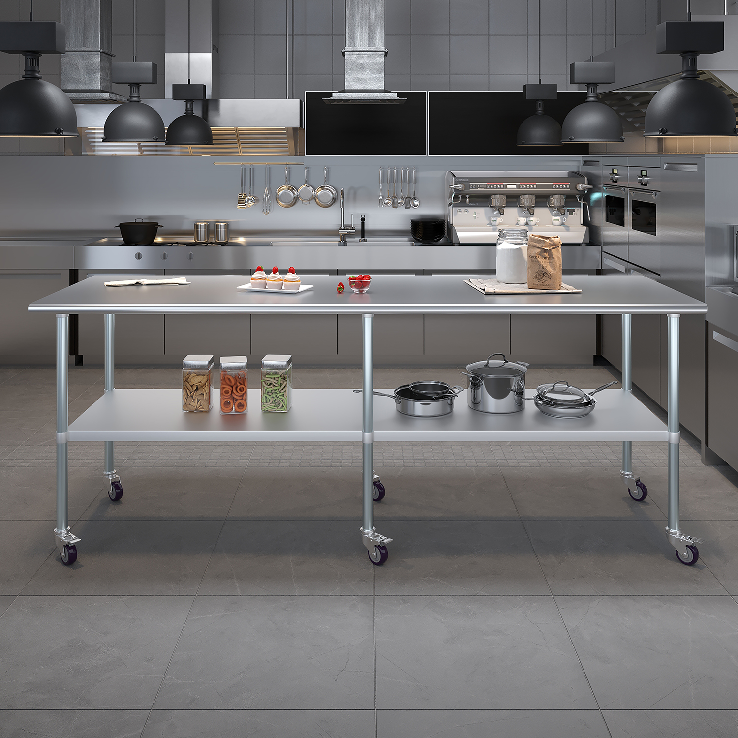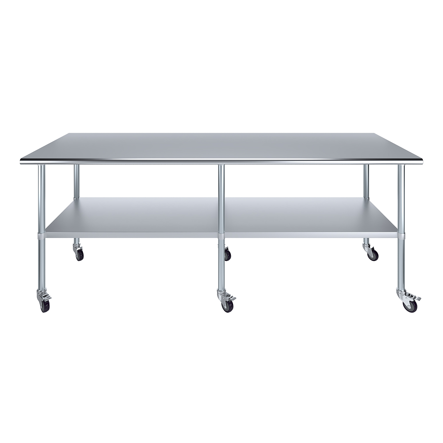 Optimize your workspace with the 30″ x 96″ Stainless Steel Work Table featuring an undershelf and a set of six wheels for enhanced mobility and storage. This work table is constructed from 18GA/430 stainless steel, ensuring a durable, easy-to-clean surface. Designed for demanding environments such as commercial kitchens, laboratories, and workshops, this table guarantees long-lasting performance and reliability.