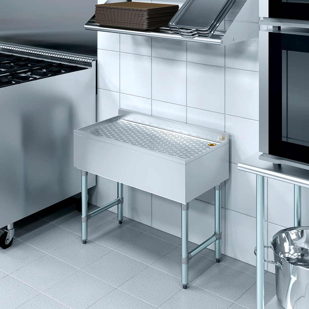 With a spacious 36 in. x 18 in. design, this underbar drainboard provides ample space for draining and drying glassware, allowing bartenders to work more efficiently while keeping the bar area organized. The slightly sloped surface ensures proper water drainage, preventing excess moisture buildup and maintaining a clean workspace.