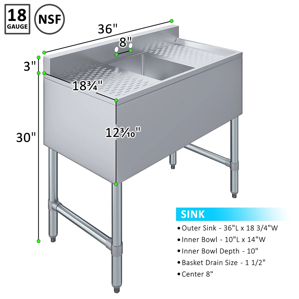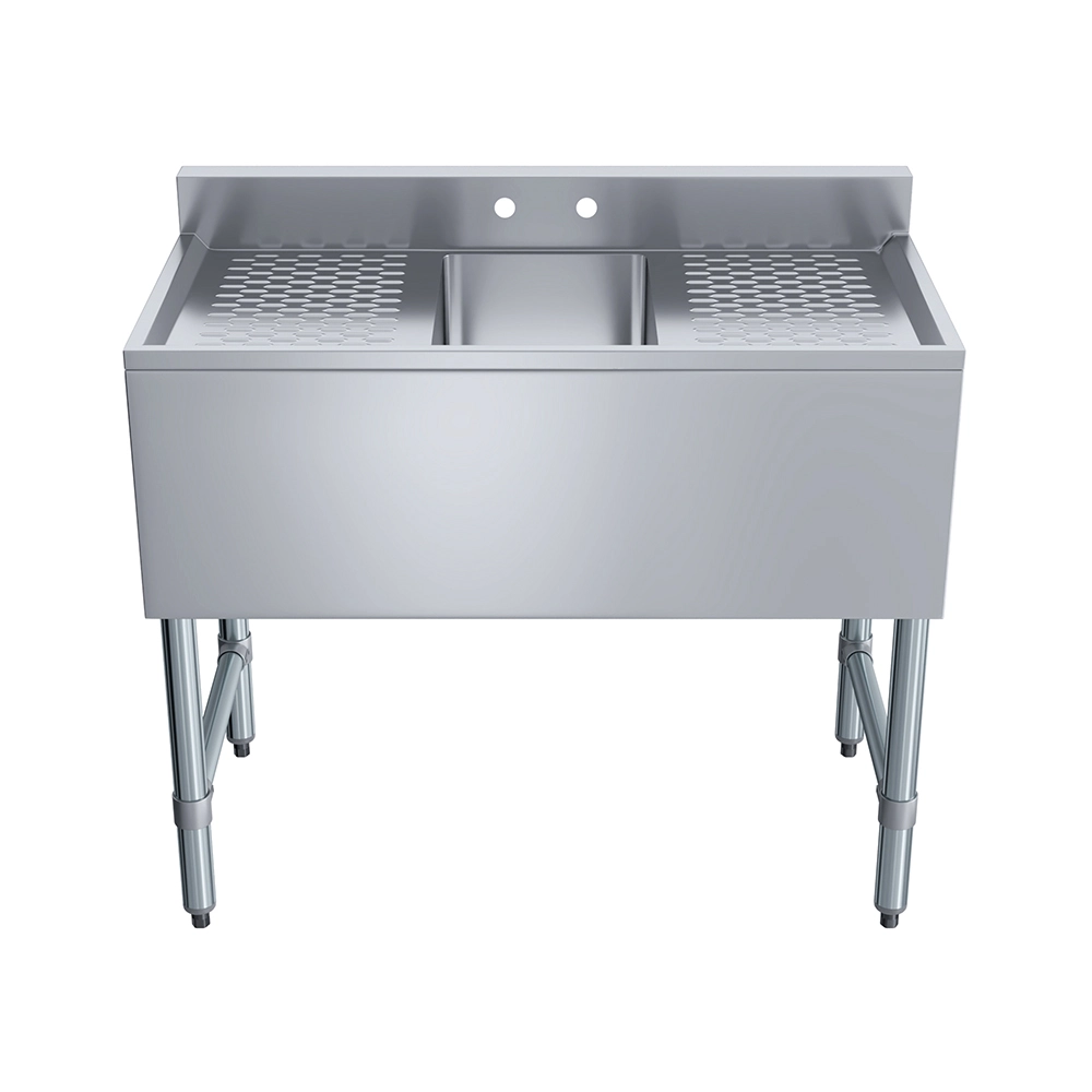 The 36 in. x 19 in. One Compartment Underbar Sink with Left and Right Drainboards is a compact, durable, and highly functional sink solution designed for commercial bars, restaurants, and beverage service areas. Constructed from 18GA/304 stainless steel, it offers excellent resistance to corrosion and wear, ensuring long-lasting performance even in demanding environments. Its easy-to-clean surface helps maintain a sanitary and professional workspace.