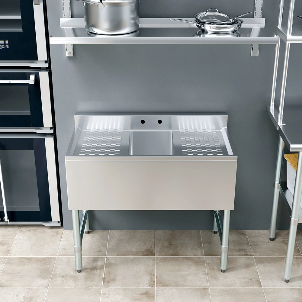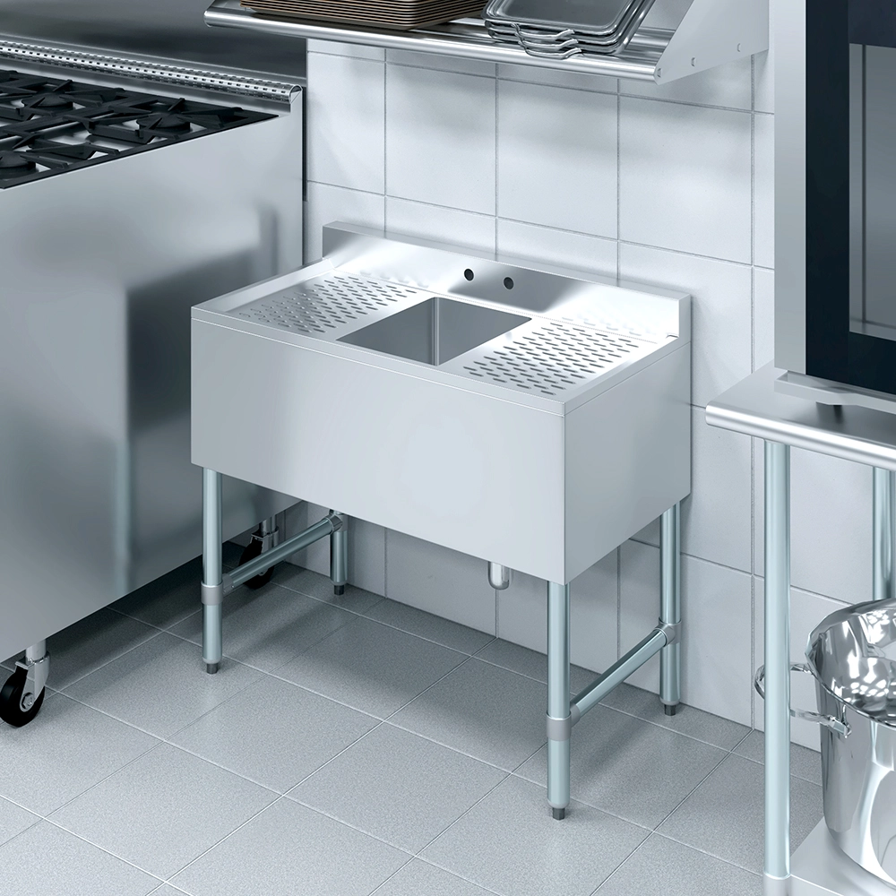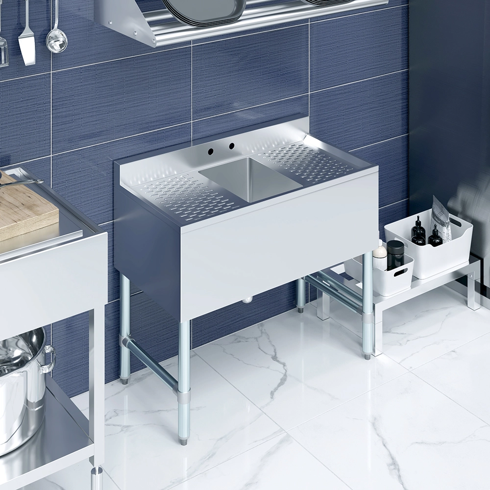 The central single compartment is ideal for quick washing, rinsing, or sanitizing of barware, utensils, or prep items. With integrated left and right drainboards, this sink provides ample space for air-drying, staging, or organizing clean and dirty items, enhancing workflow efficiency and cleanliness. The slightly pitched boards help prevent water accumulation and direct runoff toward the sink.
