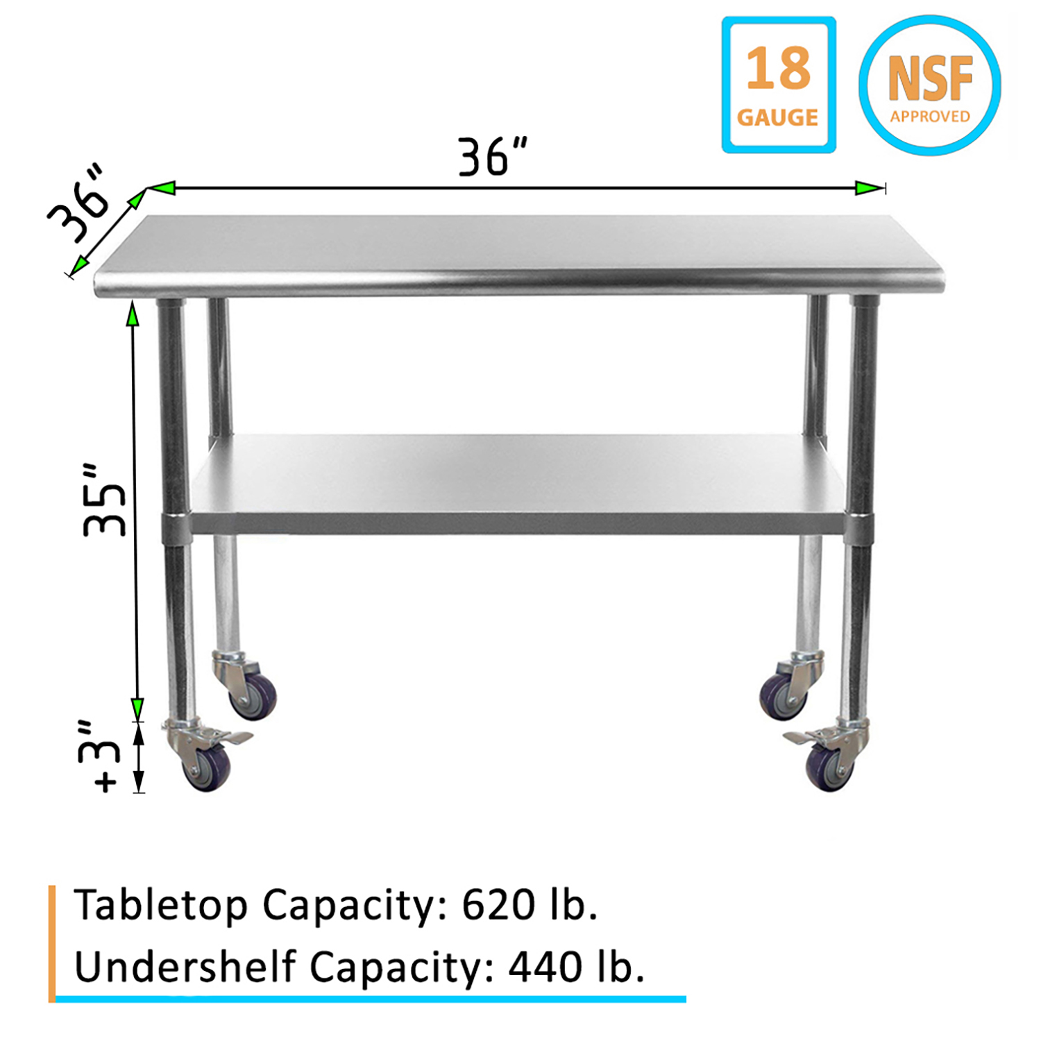 Optimize your workspace with the 36″ x 36″ Stainless Steel Work Table featuring an undershelf and a set of four wheels for enhanced mobility and storage. This work table is constructed from 18GA/430 stainless steel, ensuring a durable, easy-to-clean surface. Designed for demanding environments such as commercial kitchens, laboratories, and workshops, this table guarantees long-lasting performance and reliability.