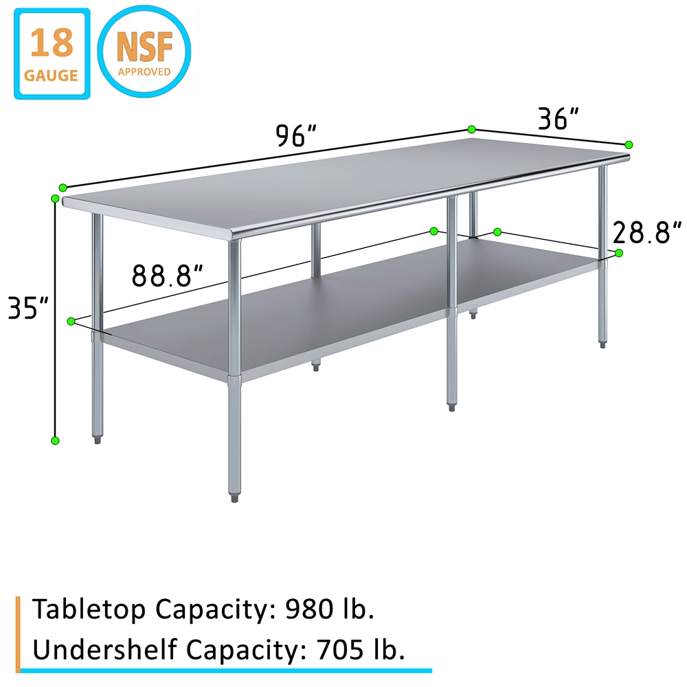 Ideal for a wide range of applications, from commercial kitchens and catering services to laboratories and workshops, the 36″ X 96″ Stainless Steel Work Table with Undershelf is a practical and stylish addition that enhances productivity and organization. Its sleek, professional appearance complements any setting, while its durable construction guarantees long-lasting performance.