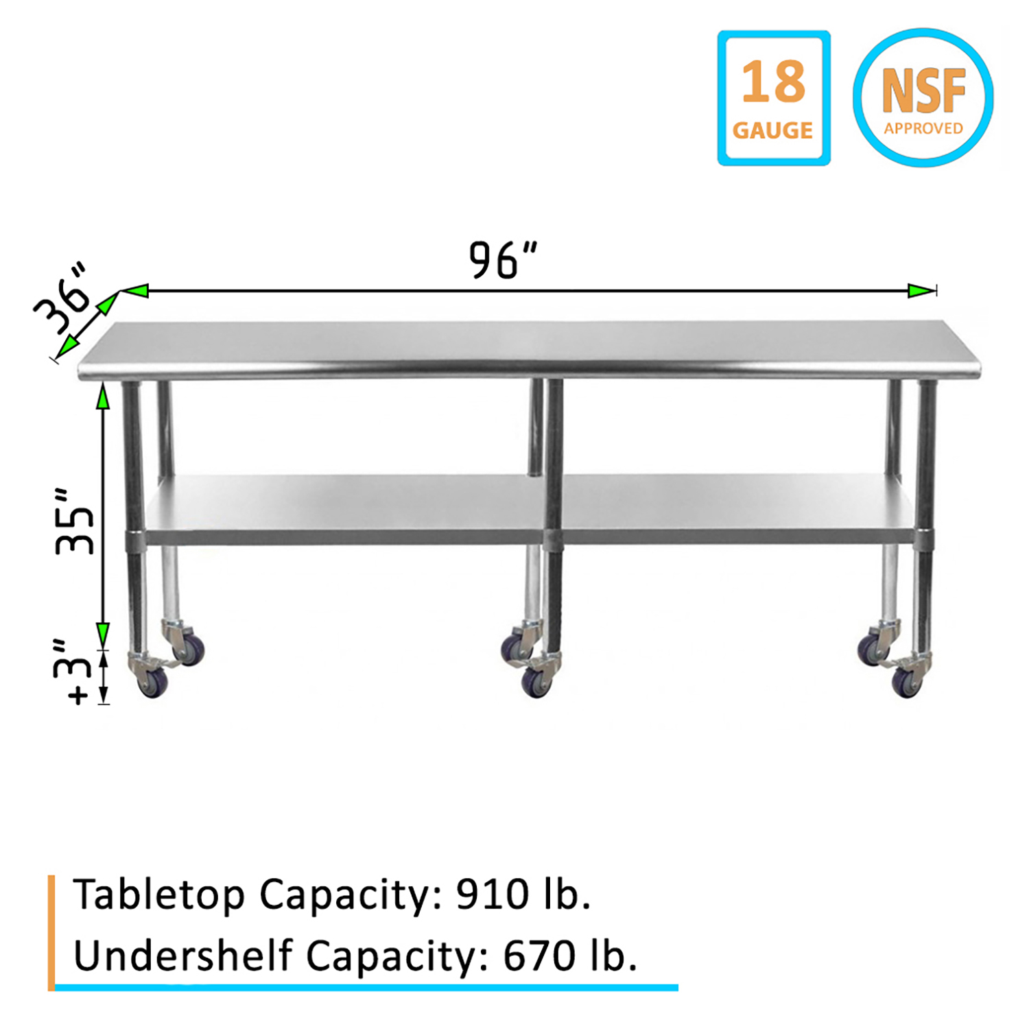 Optimize your workspace with the 36″ x 96″ Stainless Steel Work Table featuring an undershelf and a set of six wheels for enhanced mobility and storage. This work table is constructed from 18GA/430 stainless steel, ensuring a durable, easy-to-clean surface. Designed for demanding environments such as commercial kitchens, laboratories, and workshops, this table guarantees long-lasting performance and reliability.