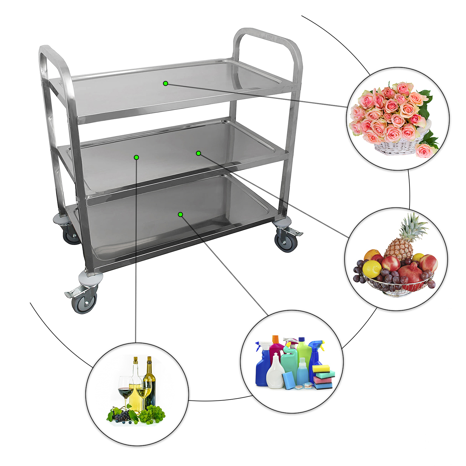 Designed with both functionality and aesthetics in mind, this stainless steel dining cart boasts a sleek and modern appearance that complements any kitchen or dining decor. Its clean lines and polished finish add a touch of professionalism to your establishment, making it not only a practical tool but also an attractive addition to your workspace.
