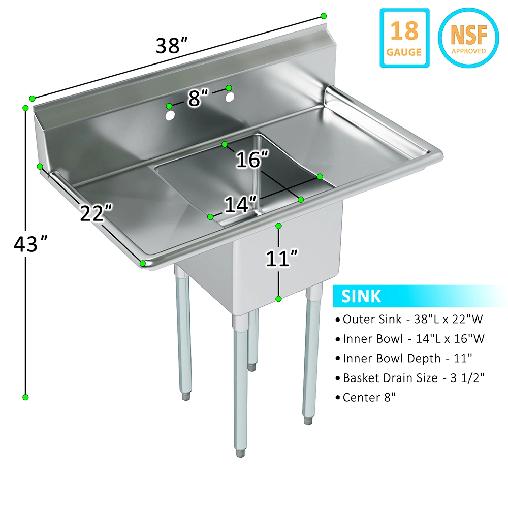 The spacious one-compartment sink provides ample room for washing pots, pans, utensils, and other large items. Its deep bowl minimizes splashing, keeping your workspace clean and organized. Measuring 38 inches by 22 inches overall, this sink is designed to handle the demands of high-traffic environments while maintaining its sleek, professional appearance.