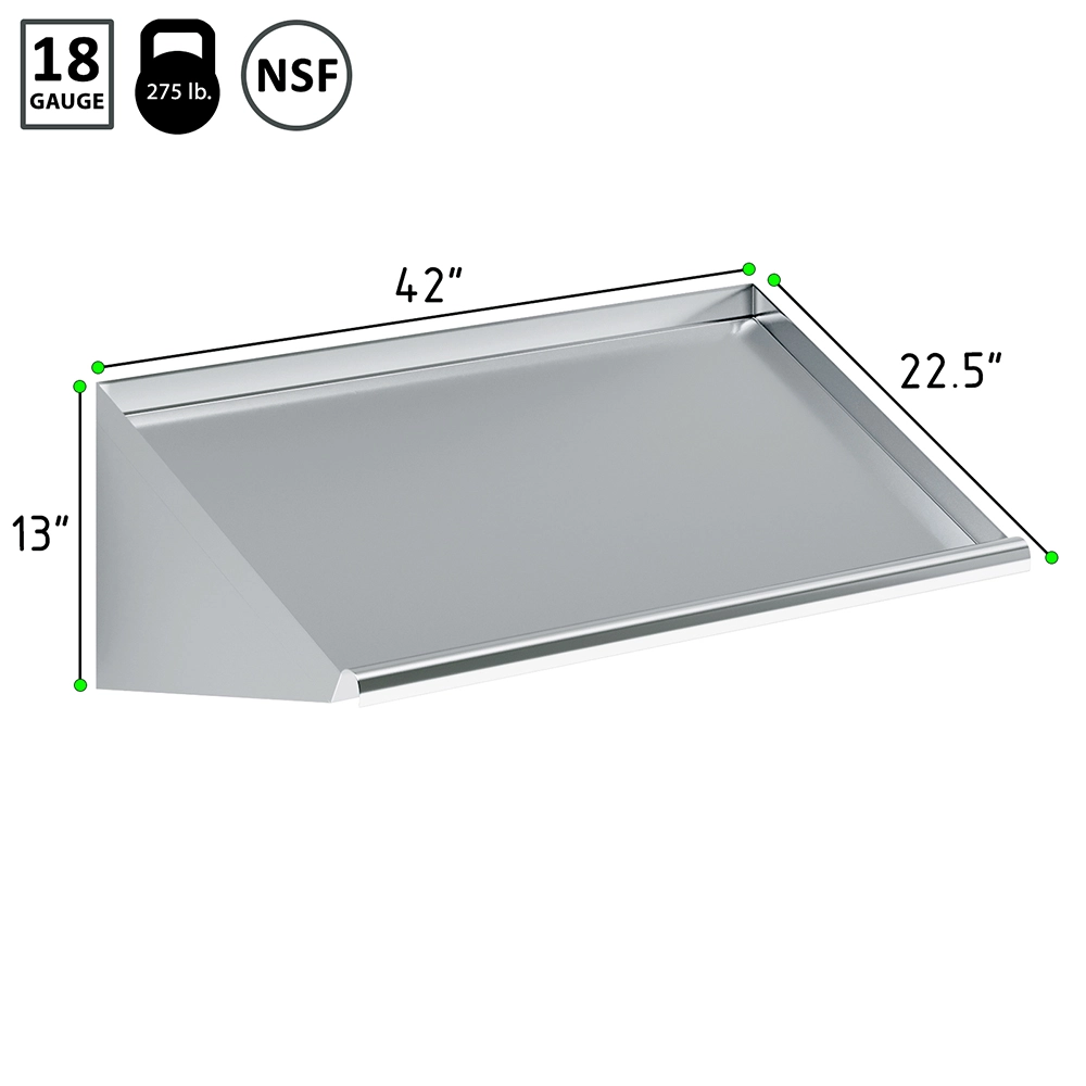 The 42 in. Stainless Steel Wall-Mounted Slanted Rack Shelf is a versatile and durable storage solution designed to optimize organization and accessibility in your workspace. Made from 18GA/304 stainless steel, this rack shelf is resistant to corrosion and stains, ensuring long-lasting performance even in demanding environments such as commercial kitchens, restaurants, and utility areas.