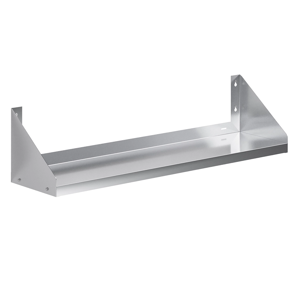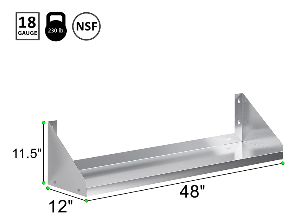 The shelf measures 48 inches in length and 12 inches in depth, providing ample space to store and display a variety of items, from kitchen utensils and appliances to tools and supplies. The addition of side guards is a thoughtful design feature that helps keep your items securely in place, preventing spills and ensuring a neat and orderly storage area. These side guards make the shelf particularly useful in busy kitchens, workshops, and other high-traffic areas where maintaining organization is crucial.