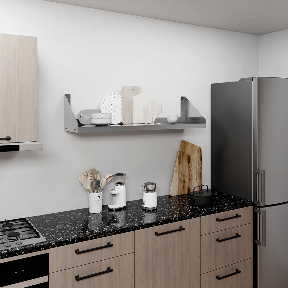 Ideal for a wide range of applications, the 48″ Long x 12″ Deep Stainless Steel Wall Shelf with Side Guards is perfect for homes, restaurants, cafes, and various commercial settings. Its robust construction ensures it can handle heavy loads, providing reliable performance day in and day out. The versatility of this shelf makes it a valuable addition to any environment where space optimization and organization are priorities.