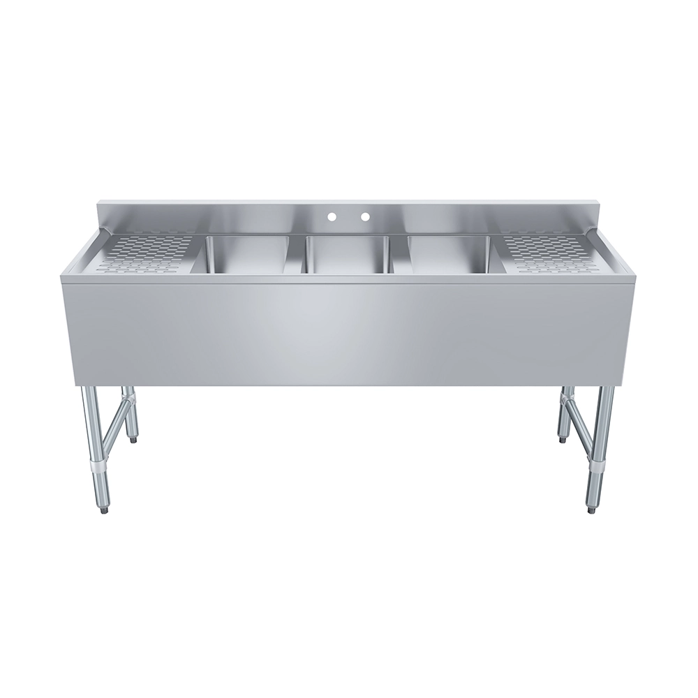 The central single compartment is ideal for quick washing, rinsing, or sanitizing of barware, utensils, or prep items. With integrated left and right drainboards, this sink provides ample space for air-drying, staging, or organizing clean and dirty items, enhancing workflow efficiency and cleanliness. The slightly pitched boards help prevent water accumulation and direct runoff toward the sink.