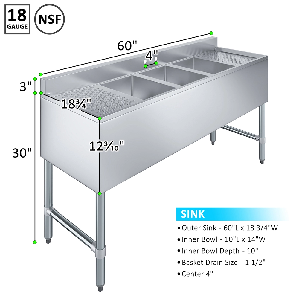 The 60 in. x 19 in. One Compartment Underbar Sink with Left and Right Drainboards is a compact, durable, and highly functional sink solution designed for commercial bars, restaurants, and beverage service areas. Constructed from 18GA/304 stainless steel, it offers excellent resistance to corrosion and wear, ensuring long-lasting performance even in demanding environments. Its easy-to-clean surface helps maintain a sanitary and professional workspace.