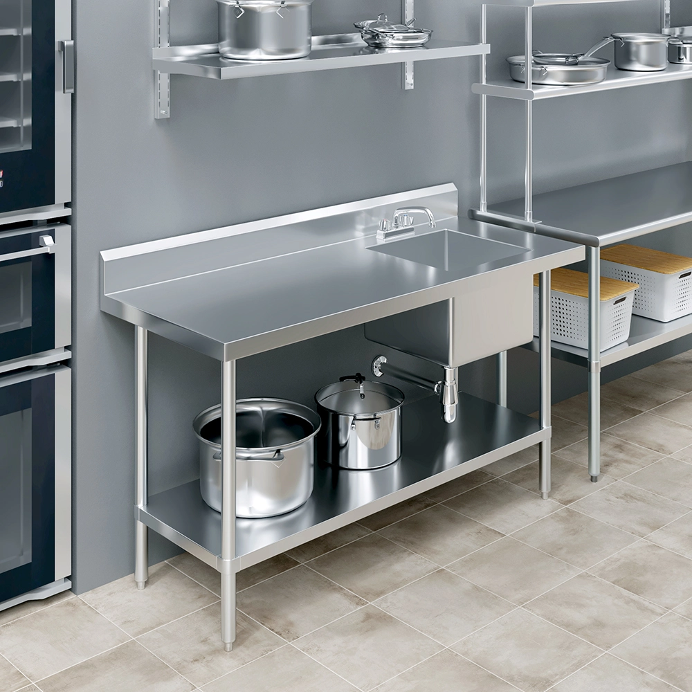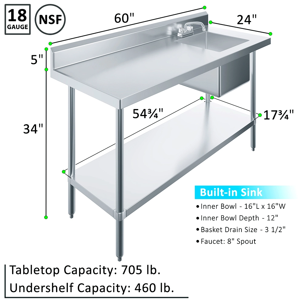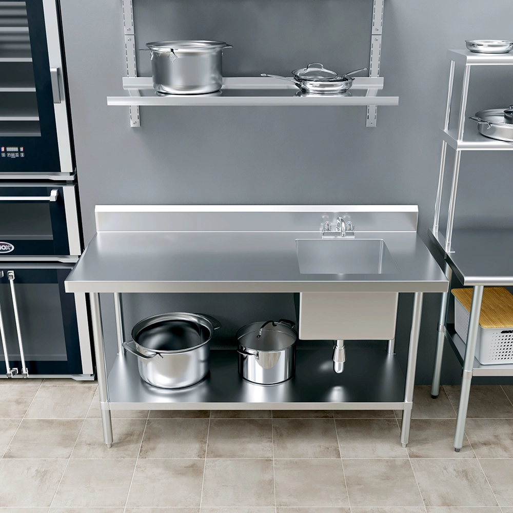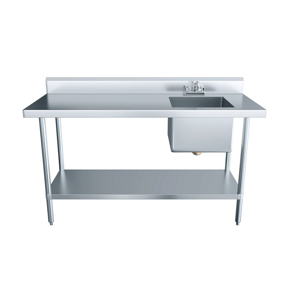 The 60 in. x 24 in. Stainless Steel Work Table with Built-in Right Prep Sink and Faucet is a versatile and space-efficient solution designed to streamline food preparation and cleanup in commercial kitchens, restaurants, and catering environments. Constructed from 18GA/430 stainless steel, this unit offers excellent durability and easy maintenance, making it ideal for high-demand foodservice operations.