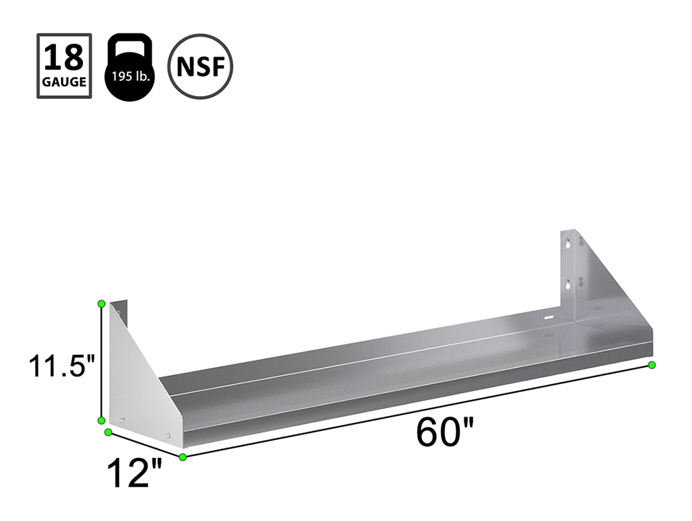 The shelf measures 60 inches in length and 12 inches in depth, providing ample space to store and display a variety of items, from kitchen utensils and appliances to tools and supplies. The addition of side guards is a thoughtful design feature that helps keep your items securely in place, preventing spills and ensuring a neat and orderly storage area. These side guards make the shelf particularly useful in busy kitchens, workshops, and other high-traffic areas where maintaining organization is crucial.