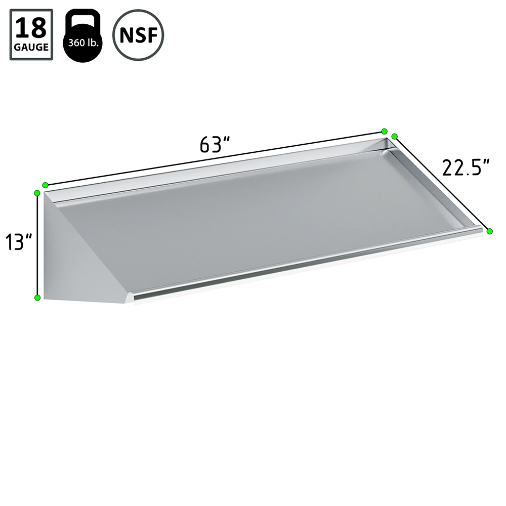 Easy to install, the 63 in. Stainless Steel Wall-Mounted Slanted Rack Shelf includes the necessary hardware for secure mounting, allowing for quick setup. Its sleek and professional design blends seamlessly into any environment, from modern kitchens to industrial utility spaces, enhancing both functionality and aesthetics.