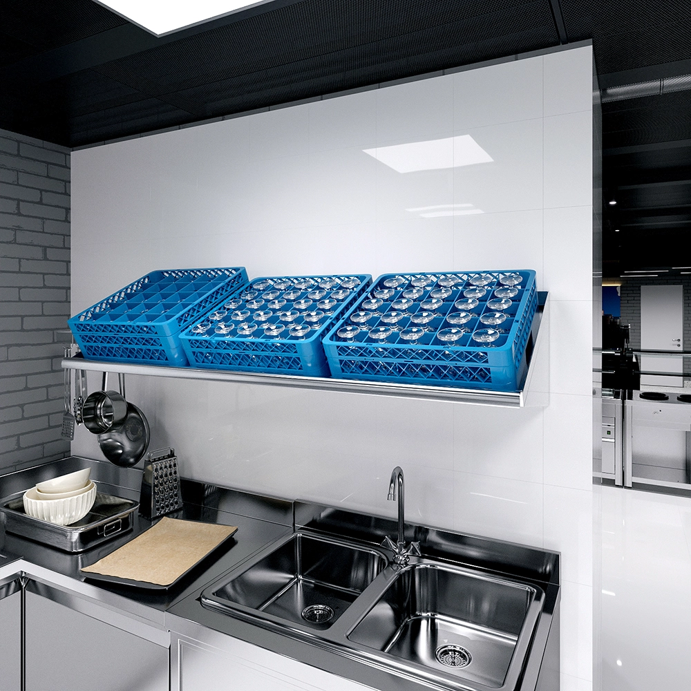 Wall-mounted for convenience, this shelf saves valuable floor and countertop space, making it an excellent choice for kitchens or workspaces with limited room. The sturdy construction ensures it can securely hold multiple items, offering a practical and reliable storage solution. The smooth stainless steel surface is easy to clean, ensuring hygiene and a polished appearance.