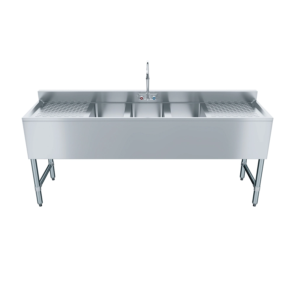 Featuring three deep compartments, this sink allows for an efficient washing, rinsing, and sanitizing process, making it ideal for barware, glassware, and utensils. The two integrated drainboards provide additional workspace for drying and staging, helping to maintain an organized and clutter-free bar area. The included faucet ensures convenient water access, enhancing workflow and efficiency during peak hours.