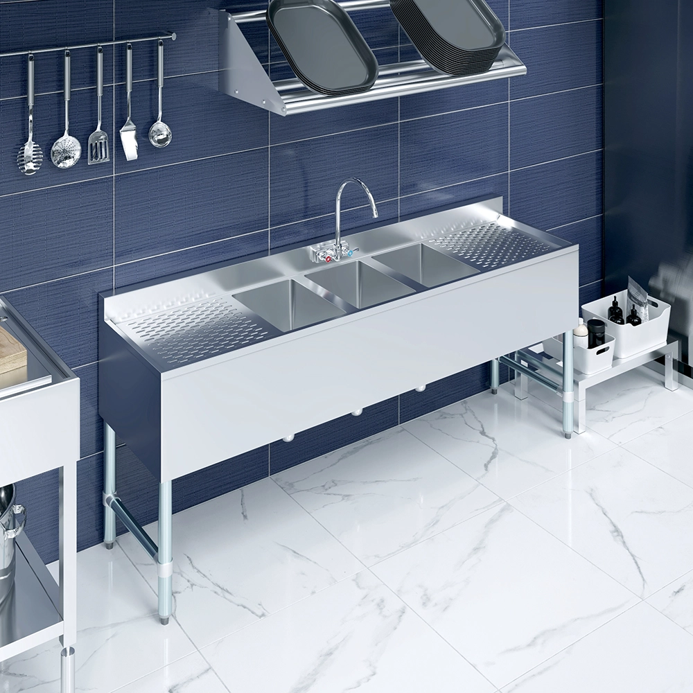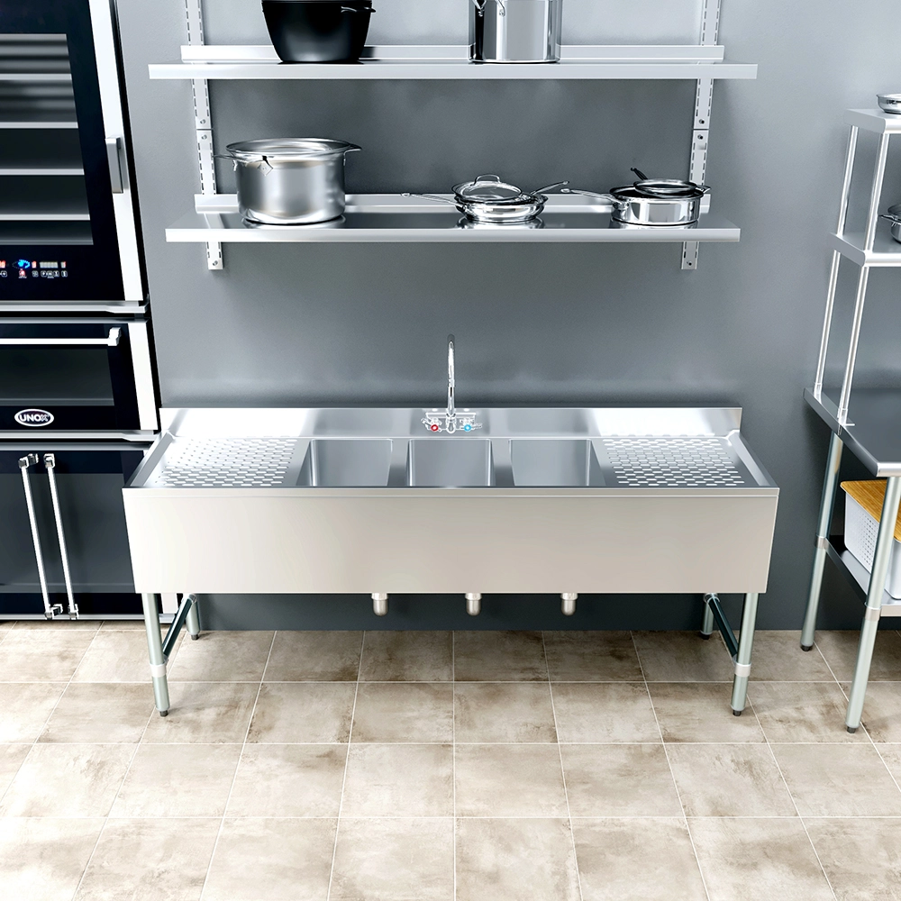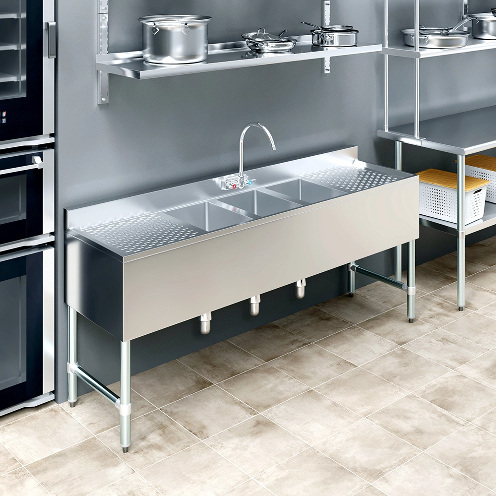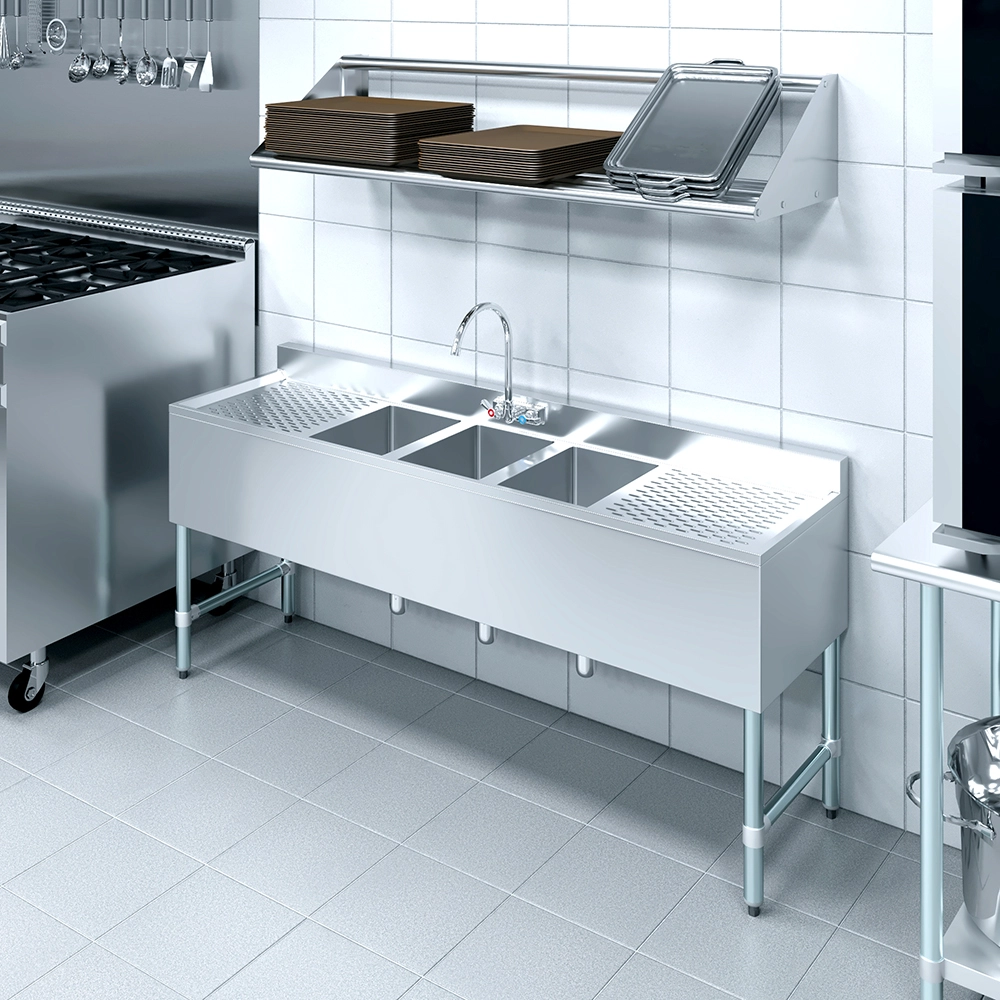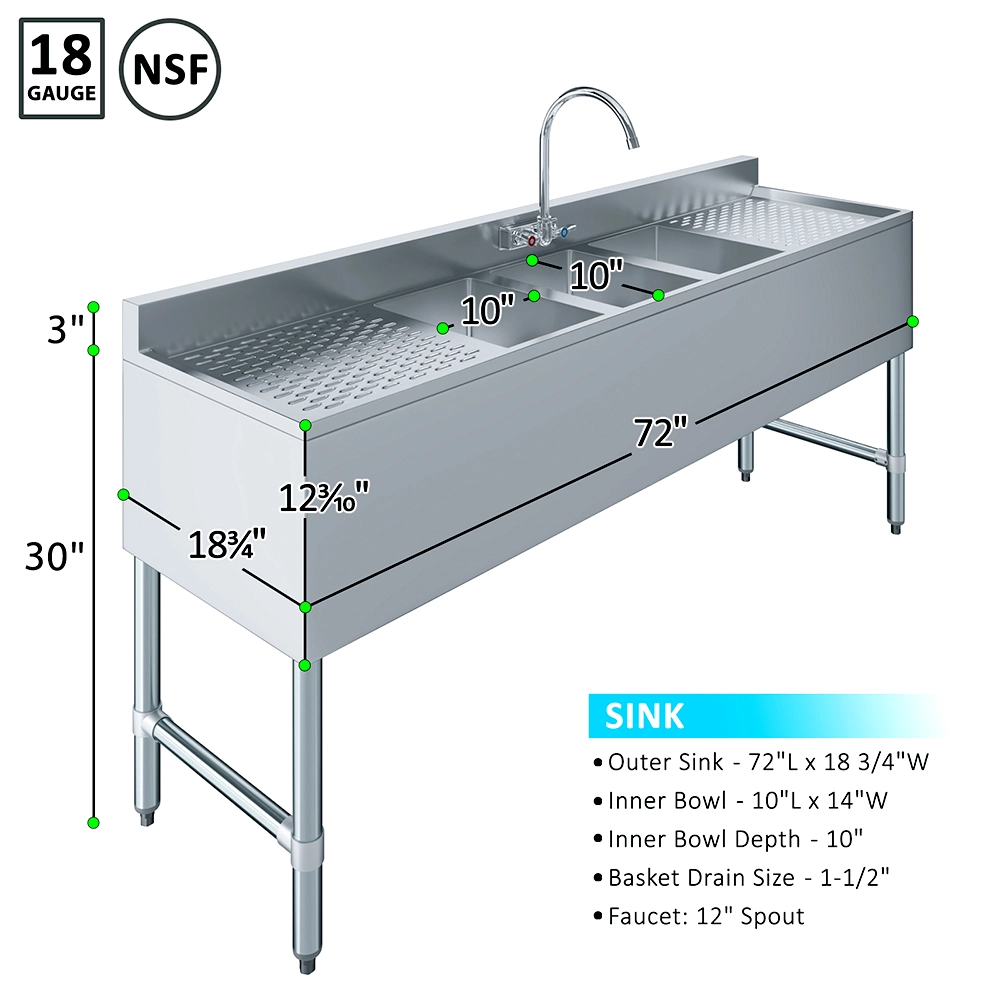 The 72 in. x 19 in. Three Compartment Underbar Sink with Two Drainboards and Faucet is a space-efficient solution designed for commercial bars, restaurants, and beverage service areas. Constructed from 18GA/304 stainless steel, this sink is highly durable, corrosion-resistant, and easy to clean, ensuring long-lasting performance in high-traffic environments. Its sleek, professional design enhances functionality while maintaining a sanitary workspace.