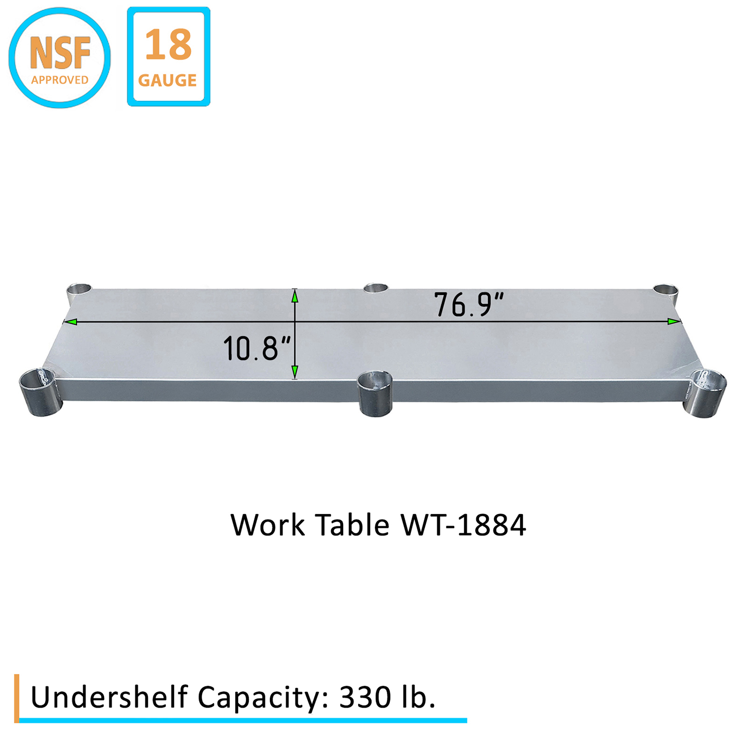 The undershelf seamlessly fits beneath your 18″ X 84″ work table, offering a convenient storage solution for tools, equipment, and supplies. Its robust construction supports heavy items, making it ideal for storing pots, pans, small appliances, and other essentials. The sleek stainless steel finish not only adds a professional look to your workspace but also makes cleaning and maintenance effortless.