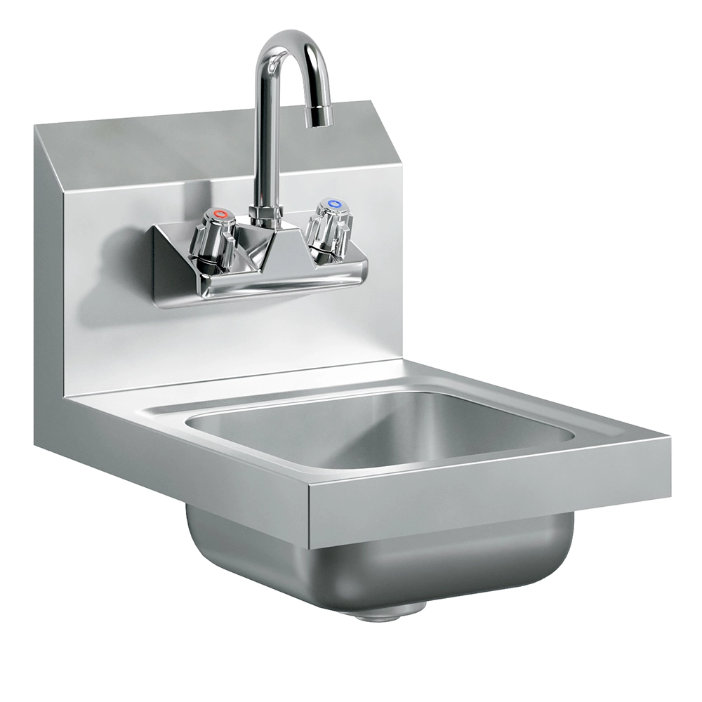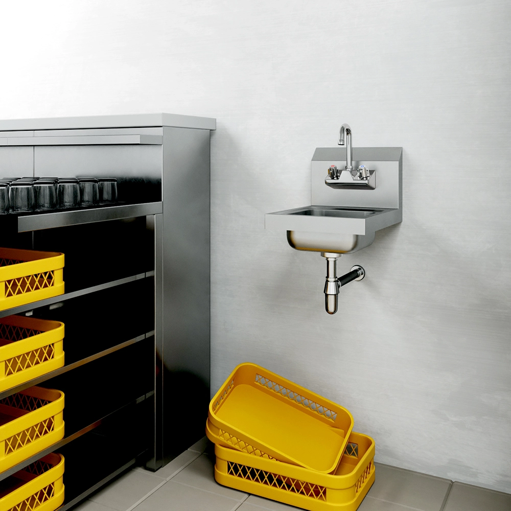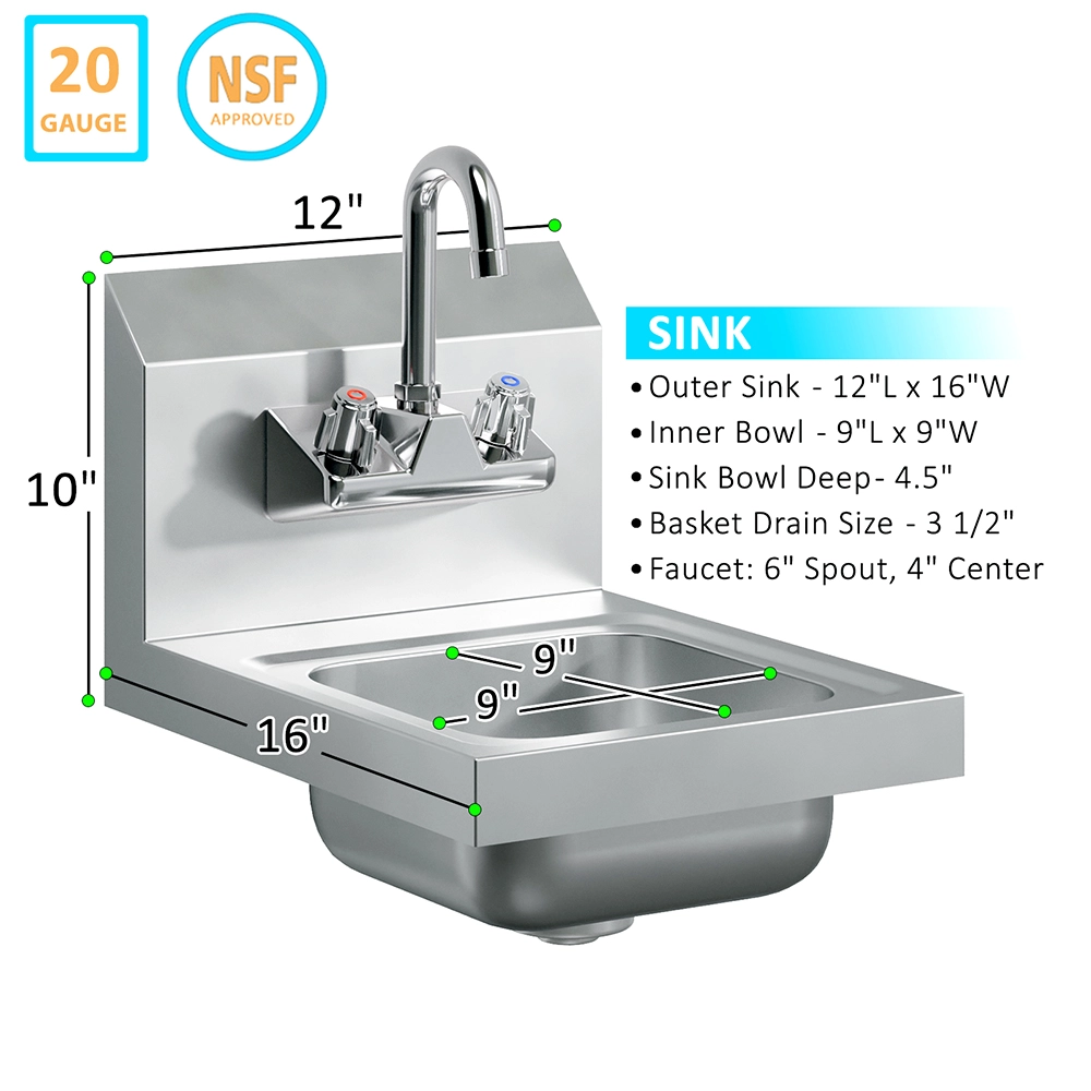 The sink’s dimensions 12″ wide by 16″ deep offer ample space for hand washing and quick rinsing tasks, while its wall-mounted design helps save valuable floor space and keeps your area organized. The integrated gooseneck faucet provides a high, curved spout, delivering comfortable clearance for hand washing and rinsing without splashing.