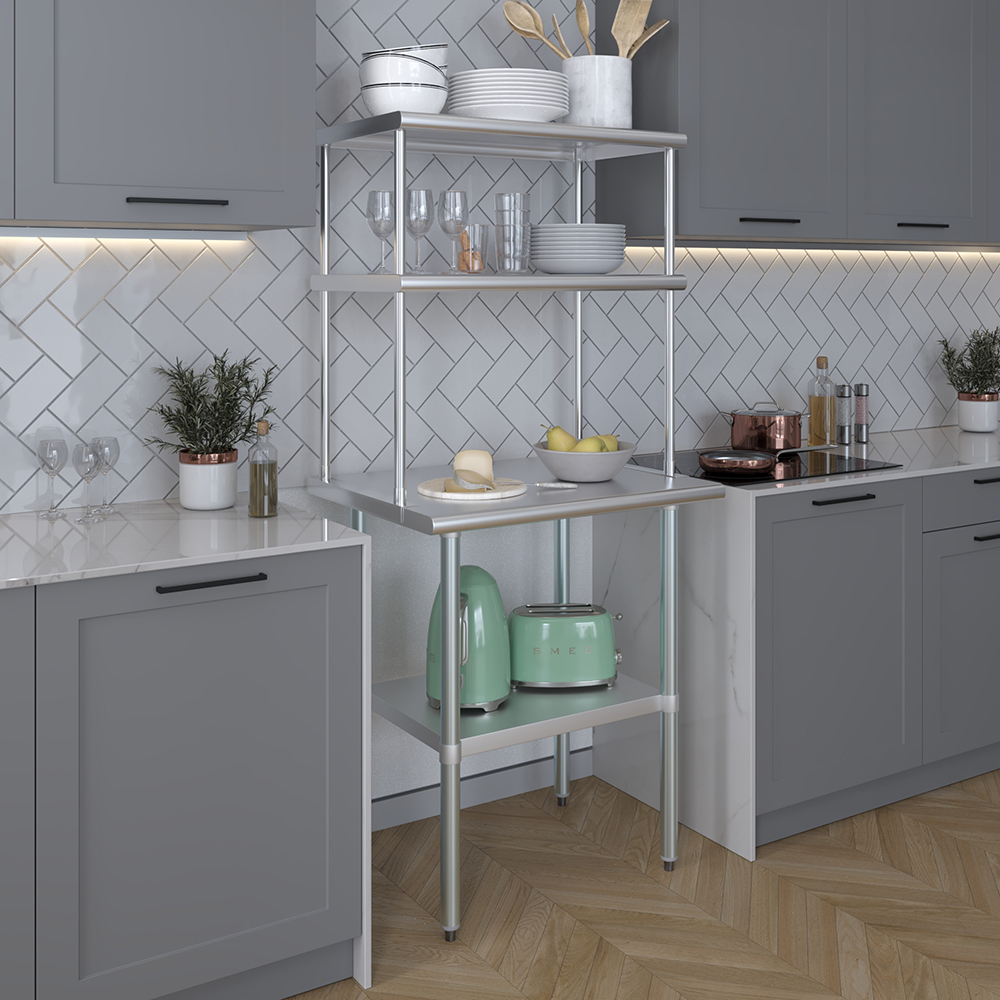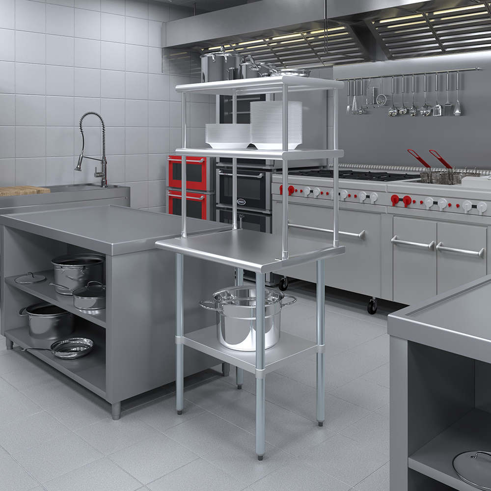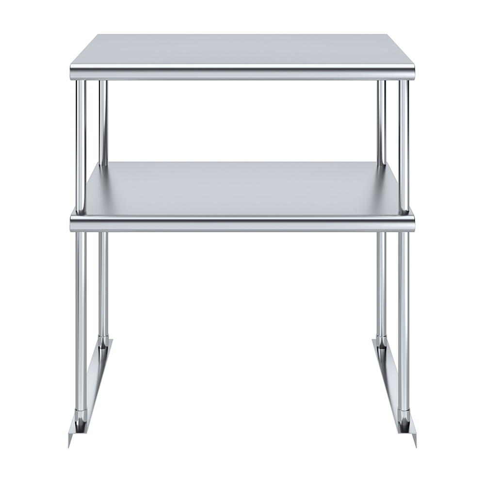 Measuring 18 inches in width and 30 inches in length, this compact yet spacious shelf offers ample storage space across two tiers. The double-tier design maximizes vertical storage capacity, making it ideal for organizing a variety of kitchen essentials, including utensils, ingredients, cookware, and equipment. The open-shelf design allows for easy access and quick retrieval of items, streamlining your workflow and improving productivity.
