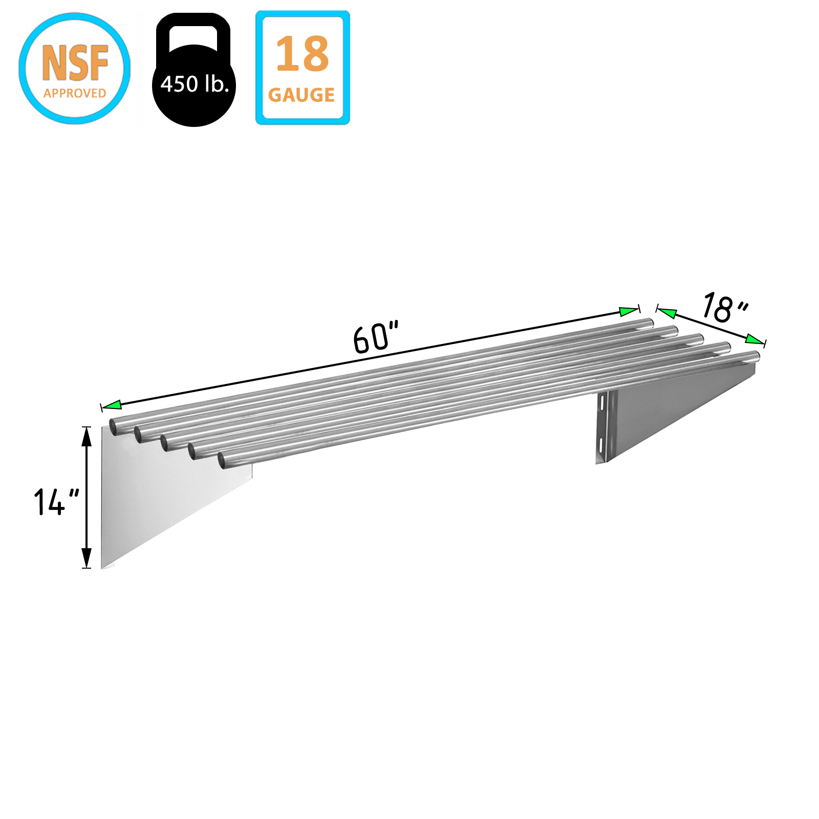 Measuring 60 inches in length and 18 inches in depth, this wall shelf offers generous storage space, perfect for organizing kitchenware, tools, supplies, and more. The robust stainless steel construction ensures long-lasting strength and resistance, even in the most demanding environments. This makes it an ideal choice for kitchens, garages, restaurants, and other commercial spaces where durability and hygiene are paramount.