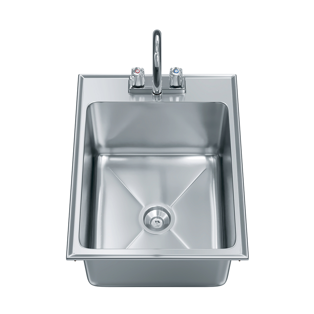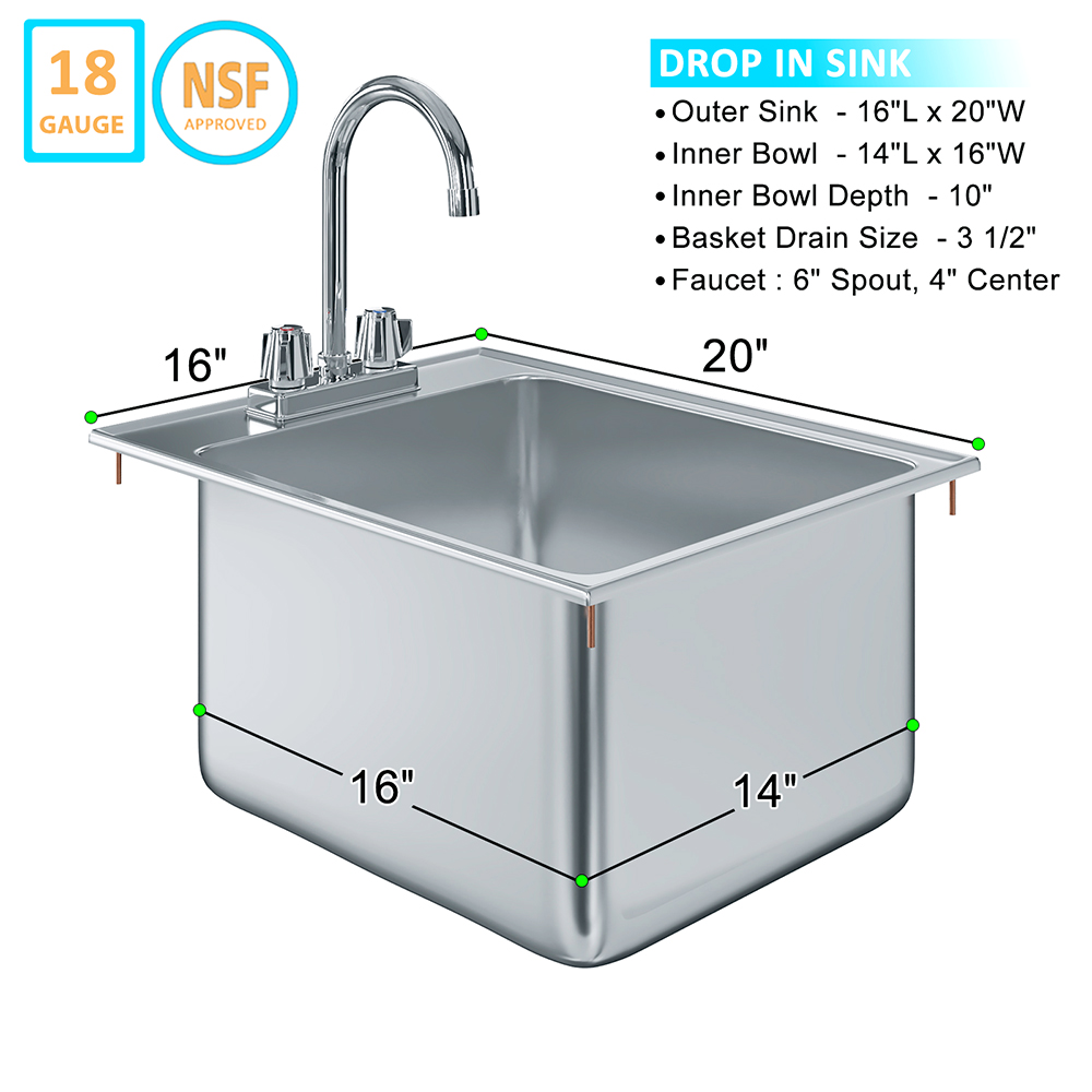 The Stainless Steel 1-Compartment Drop-In Sink is a durable and versatile solution for a variety of cleaning and prep tasks. Featuring a spacious 14 in. x 16 in. x 10 in. bowl, it provides ample space for washing, rinsing, and soaking items, making it ideal for kitchens, bars, food trucks, or utility rooms. Its 18GA/304 stainless steel construction ensures resistance to corrosion and stains, guaranteeing long-lasting performance even in demanding environments.