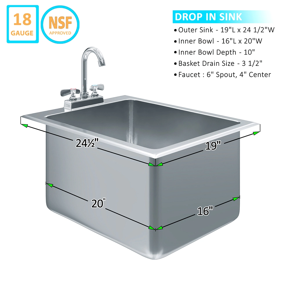 The generously sized bowl provides ample space for washing large pots, pans, or utensils, making it ideal for kitchens, bars, restaurants, or utility rooms. The included faucet is designed for convenience, delivering reliable water flow for everyday tasks. With its drop-in design, the sink is easy to install, fitting seamlessly into countertops for a clean and efficient workspace.