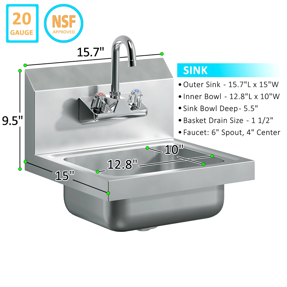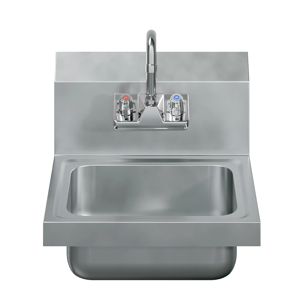 This sink is equipped with a faucet for convenient water access, allowing for easy handwashing and quick cleaning tasks. Its compact 15 in. x 15 in. size makes it perfect for tight spaces such as restaurant kitchens, bars, food trucks, utility rooms, or restrooms. The space-saving design does not compromise on functionality, providing a practical and durable washing station wherever needed.