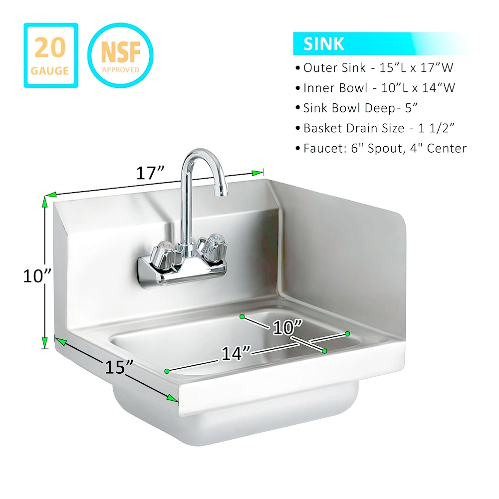 The Stainless Steel Wall-Mounted Hand Sink, measuring 17 in. x 15 in., is a durable and space-saving solution designed for commercial kitchens, restrooms, and healthcare environments. Constructed from 20GA/304 stainless steel, this sink easy to clean, and built to withstand heavy daily use, ensuring long-lasting performance in demanding settings. Its sleek, polished finish enhances hygiene while maintaining a professional appearance.